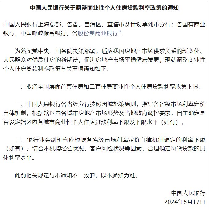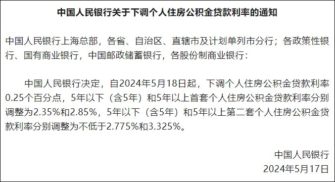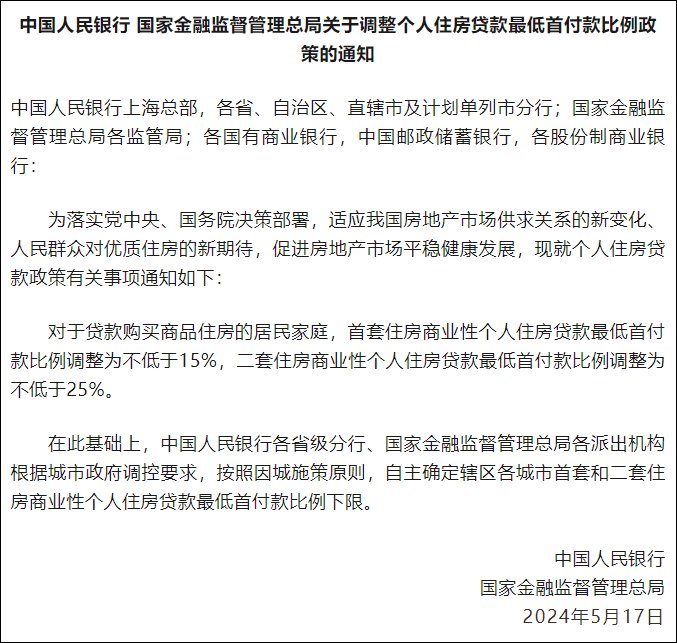 5月17日,央行连发三条重磅新政,包括《中国人民银行关于调整商业性个人住房贷款利率政策的通知》《中国人民银行关于下调个人住房公积金贷款利率的通知》《中国人民银行国家金融监督管理总局关于调整个人住房贷款最低首付款比例政策的通知》。